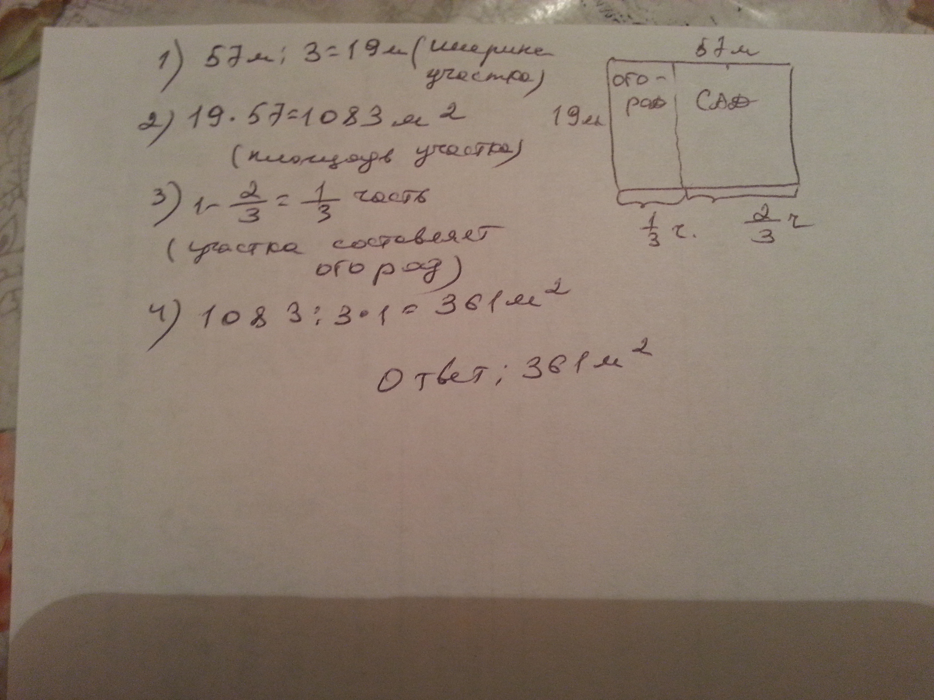 Садом заняты 2/3 площади участка остальная площадь занята огородом Сколько квадратных метров участка занятого огородом
