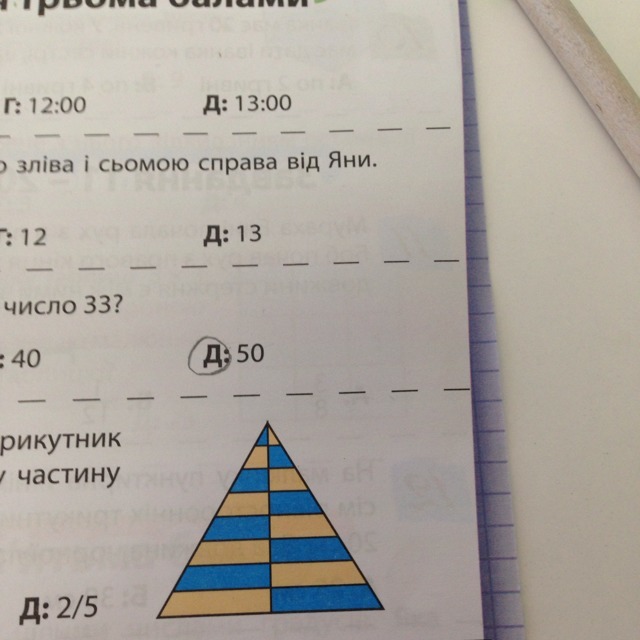 На малюнку зображений смугастий рівнобедриний трикутник і його висота. Усі смужки мають однакову висоту. Яку частину площі трикутника складає площа жовтих смужок