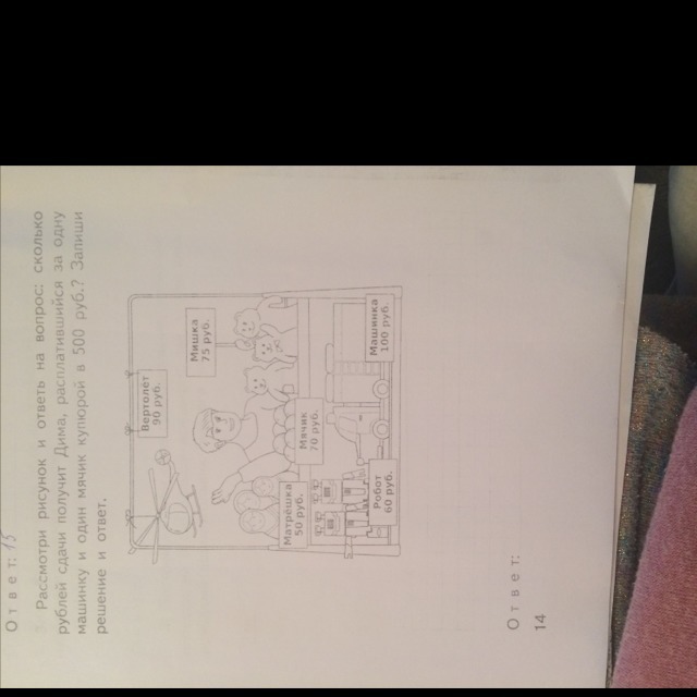 Рисунок и ответь на вопрос: сколько рублей сдачи получит Дима, расплатившись за одну машинку и один мячик купюры в 500 руб. ? Запиши решение. ответ Фотографии есть. Помогите пожалуйста ради бога