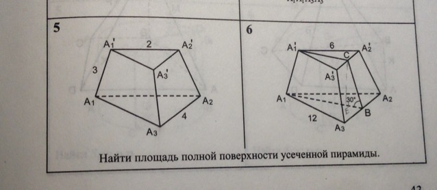 есть указание "проведем СЕ перпендикуляр А1В. СЕ-высота усеченной пирамиды. ВЕ=r1-r2=2корней из 3-корень из 3,где r1 и r2 радиусы окружностей, вписанных в треугольник А1А2А3 и А1'А2'А3' соответственно. из треугольника СВЕ СВ=2 СВ-высота боковой грани усеченной пирамиды". Я очень прошу, помогитееее