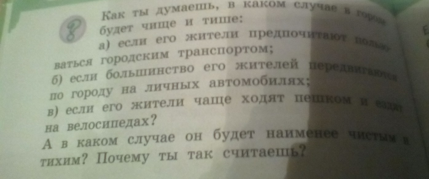 ПОМОГИТЕ ПО ОКРУЖАЮЩИЙ МИР Как ты думаешь, в каком случае в городе будет чище и тише: а) Если его жители предпочитают пользоваться городским транспортом; ... б) Если большинство его жителей передвигаются по городу на личных автомобилях; ... в) Если его жители чаще ходят пешком и ездят на велосипедах? А в каком случае он будет наименее чистым и тихим? Почему ты так считает?