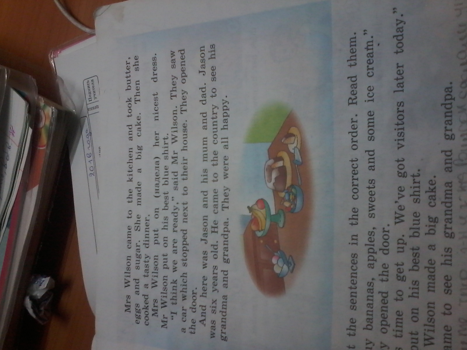 пришел на кухню и взял масло,Сахар. Она сделалабольшой торт. Тогдаприготовить вкусный ужинположить(hanena) ее лучшее платьеГ-н Уилсон надел свою лучшую голубую рубашку.Я думаюготовы,сказал мистер Уилсон. Они увиделиАР, который остановился рядом с их домом. Они Открылидверь.И здесь был Джейсон и его мама и папа. ДжейсонБылстарый.бабушка и дедушка. Они все были счастливы-т приговоры в правильном порядке. Читать ихЛы бананы, яблоки, сладости и мороженое.открыл дверь.пора вставать. У нас сегодня гости позже.Юта на своей лучшей синей рубашке.Уилсон сделал большой торт.мне, чтобы увидеть его бабушка и дедушка.