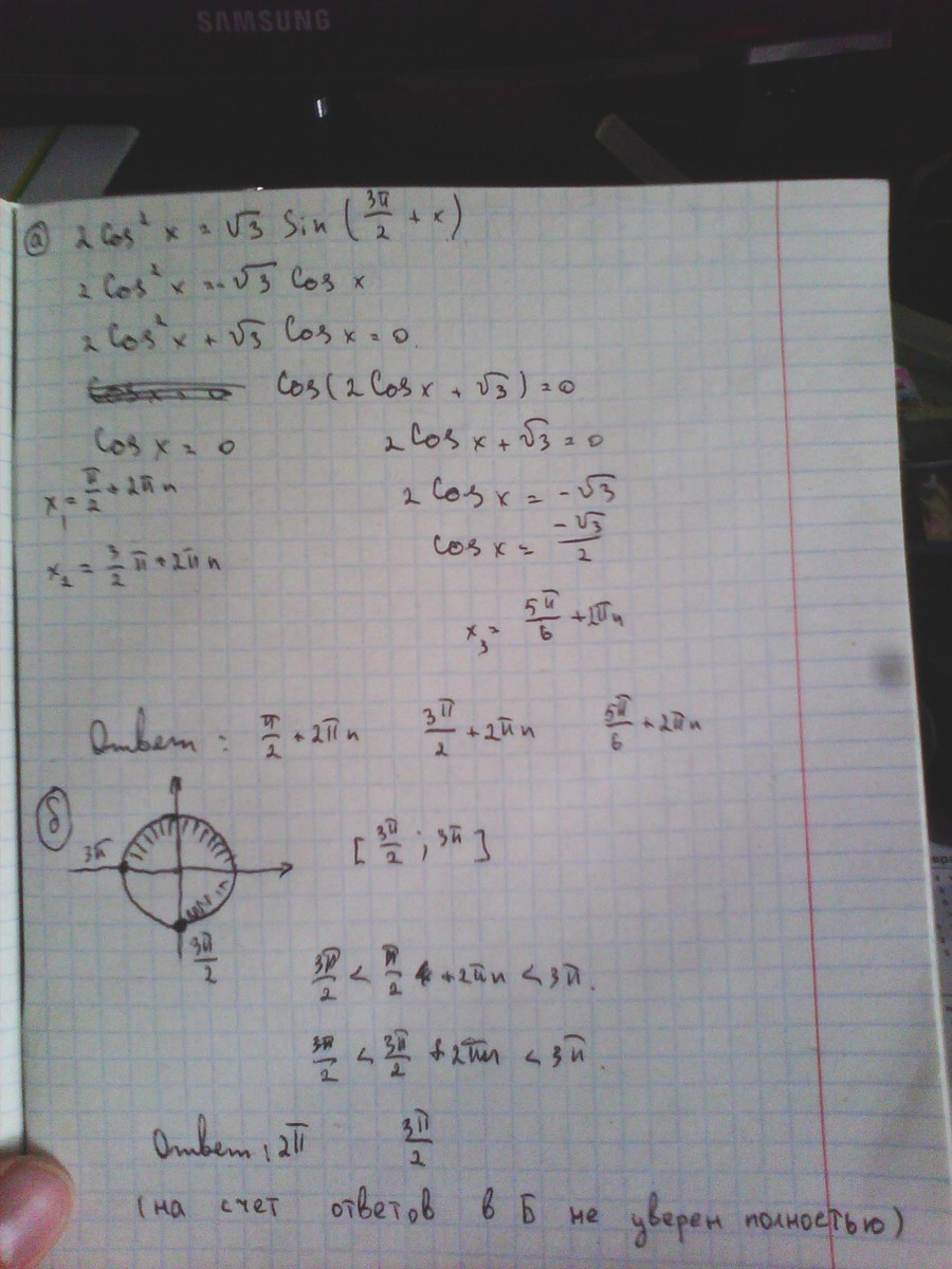 1)Решите уравнение: 2cos^2(в квадрате)x=sqrt3sin(3pi/2+x) 2)Найти все корни этого уравнения на промежутке [3pi/2;3pi]