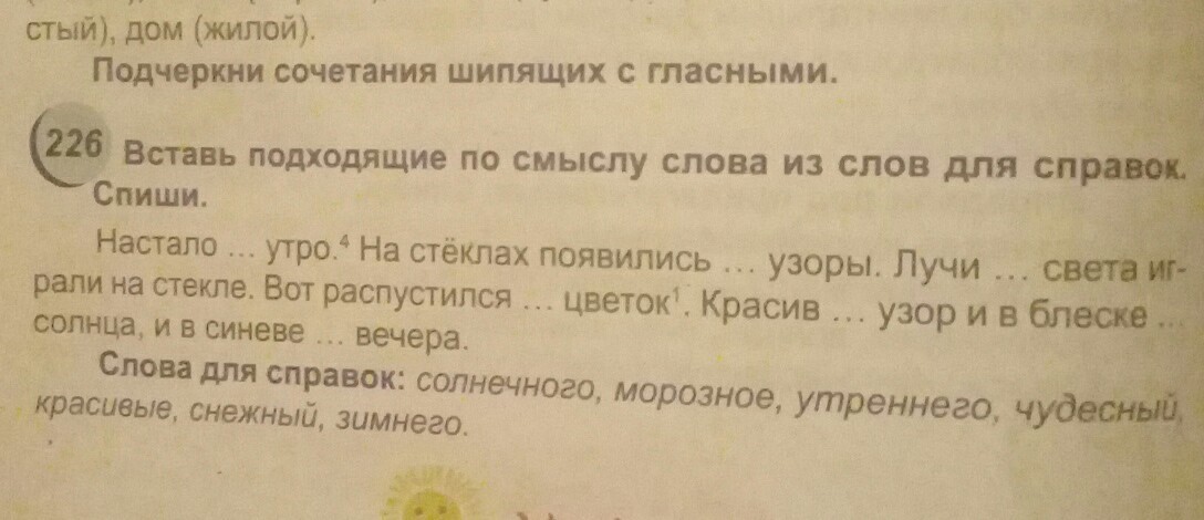 Настало морозное утро. На стеклах появились красивые узоры. Лучи солнечного света играли на стекле. Вот распустился прекрасный цветок. Красив снежный узор и в блеске утреннего солнца, и в синеве зимнего вечера.