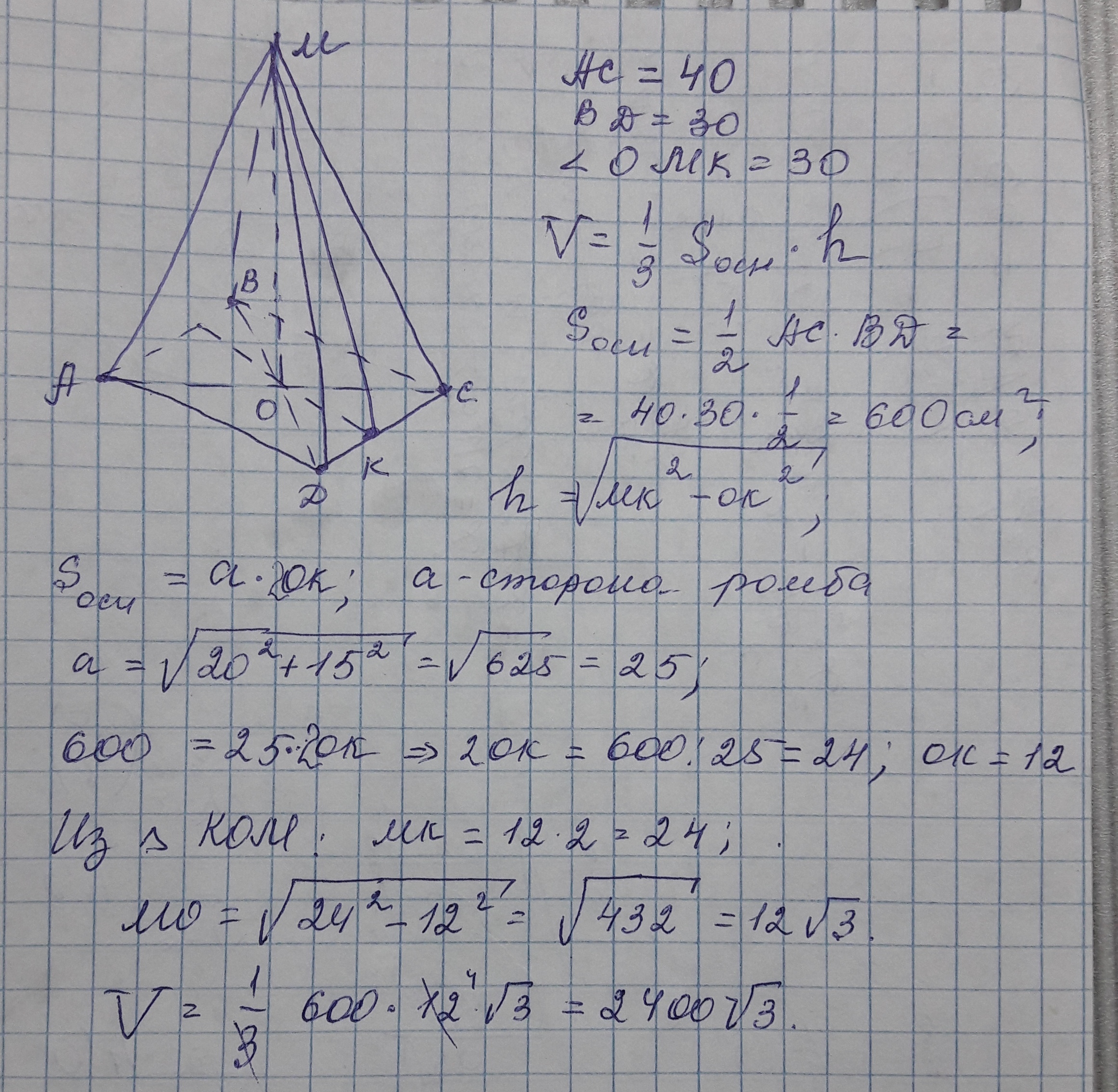 50 баллов!!! 11 класс ! основание пирамиды - ромб, диагонали которого равны 30 см и 40 см.высоты боковых граней проведены из вершины пирамиды образуют с высотой пирамиды углы равные 30 градусов. найти объем пирамиды