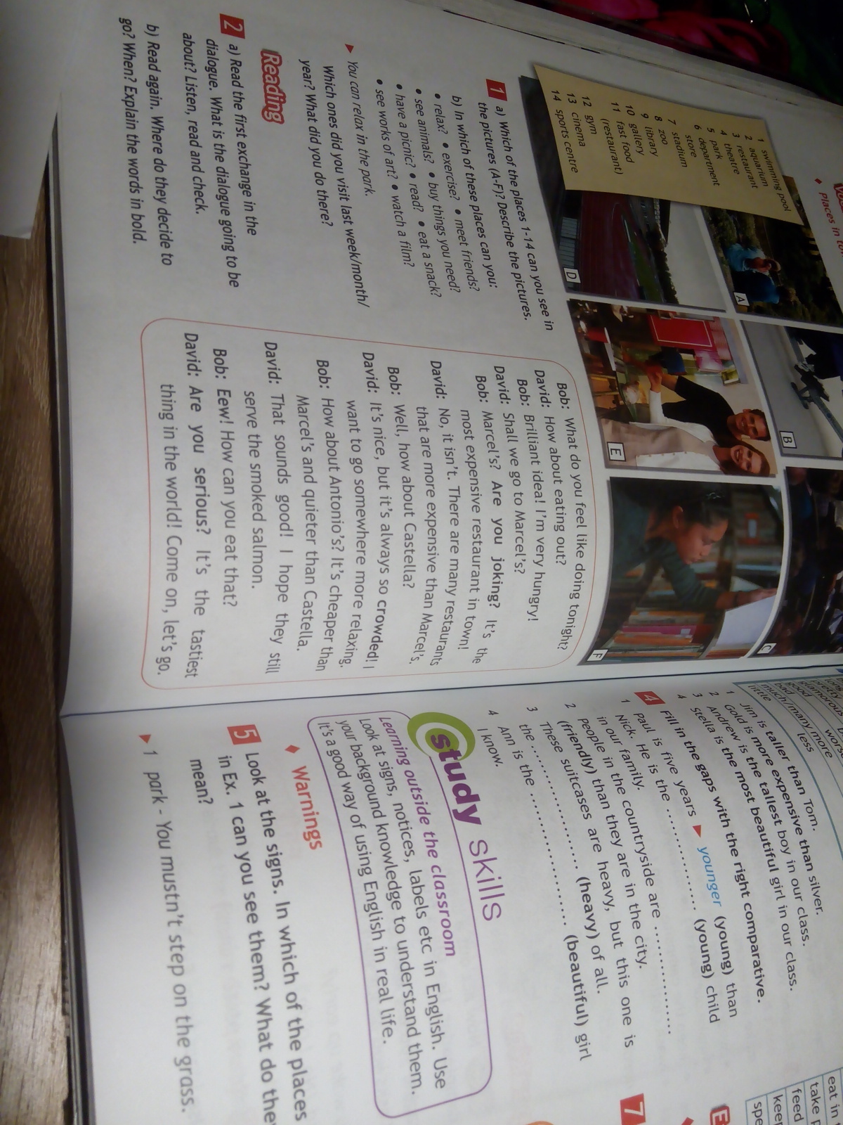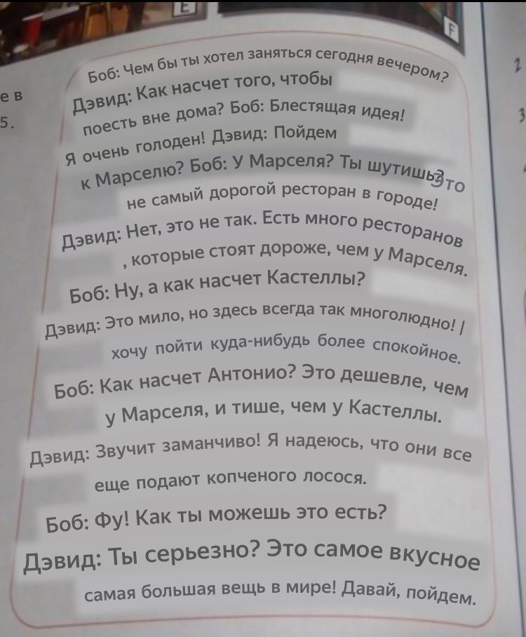 e в 5. Боб: Что ты хочешь сделать сегодня вечером? Дэвид: Как насчет того, чтобы поесть вне дома? Боб: Блестящая идея! Я очень голоден! Дэвид: Пойдем к Марселю? Боб: У Марселя? Ты шутишь? Это не самый дорогой ресторан в городе! Дэвид: Нет, это не так. Есть много ресторанов, которые стоят дороже, чем у Марселя. Боб: Ну, а как насчет Кастеллы? Дэвид: Это мило, но здесь всегда так многолюдно! | хочу пойти куда-нибудь более спокойное. Боб: Как насчет Антонио? Это дешевле, чем у Марселя, и тише, чем в Кастелле. Дэвид: Звучит заманчиво! Я надеюсь, что они все еще подают копченого лосося. Боб: Фу! Как ты можешь это есть? Дэвид: Ты серьезно? Это самая вкусная вещь в мире! Давай, пойдем.