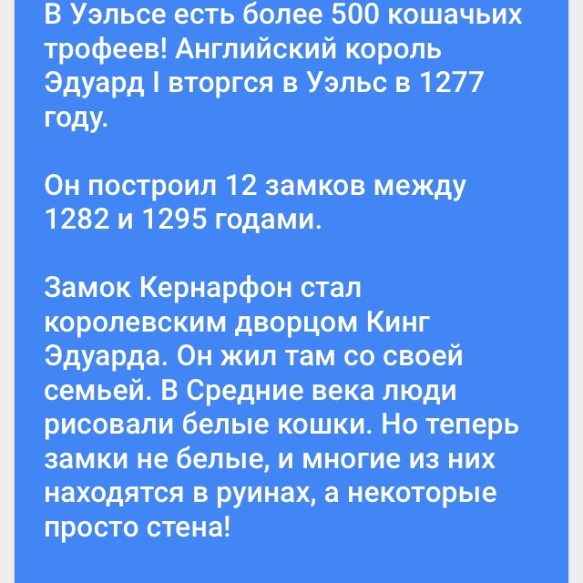 Caernarfon Castle became KIng Edward`s royal palace. He lived there with his family. In Medieval times, people painted the catles white. But now the castles aren`t white and lots of them are in ruins-some are just a wall!