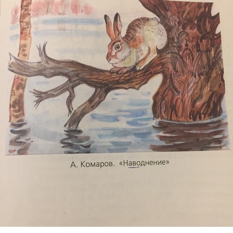 На картине «Наводнение» художник изобразил зайца, который спасается от весеннего паводка на ветке дерева.