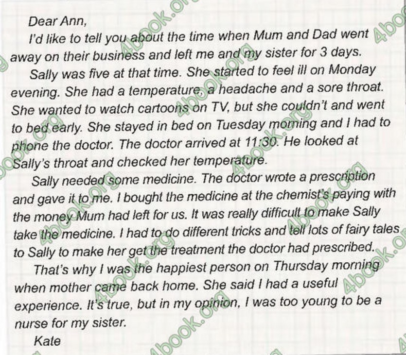 Дорога Енн, я хотів би розповісти вам про той час, коли мама і тато пішов на свій бізнес і залишив мене і мою сестру протягом 3-х днів. було п'ять років в той час. Вона почала відчувати себе погано в понеділок увечері. Вона мала температуру головний біль і біль у горлі. Вона хотіла дивитися мультфільми по телевізору, але вона не могла і рано ліг спати. Вона залишилася в ліжку у вівторок moming і повинен був зателефонувати лікарю. Лікар приїхав в 11 30 А він подивився на горло SSally і перевірив її температуру. Саллі потрібні якісь ліки. Лікар написав prescrption і віддав його мені. купив ліки в аптеки платять з грошима, мама залишила для нас. було дуже важко зробити Салі приймати ліки. Я повинен був робити різні трюки і сказати гарячі товари казок Саллі зробити hergetthe лікування прописав лікар. Ось чому я був найщасливішою людиною в четвер вранці, коли мати повернулася додому. Вона сказала, що у мене був корисний досвід. Це правда, але по-моєму, я був занадто молодий, щоб бути медсестрою для моєї сестри. Кейт
