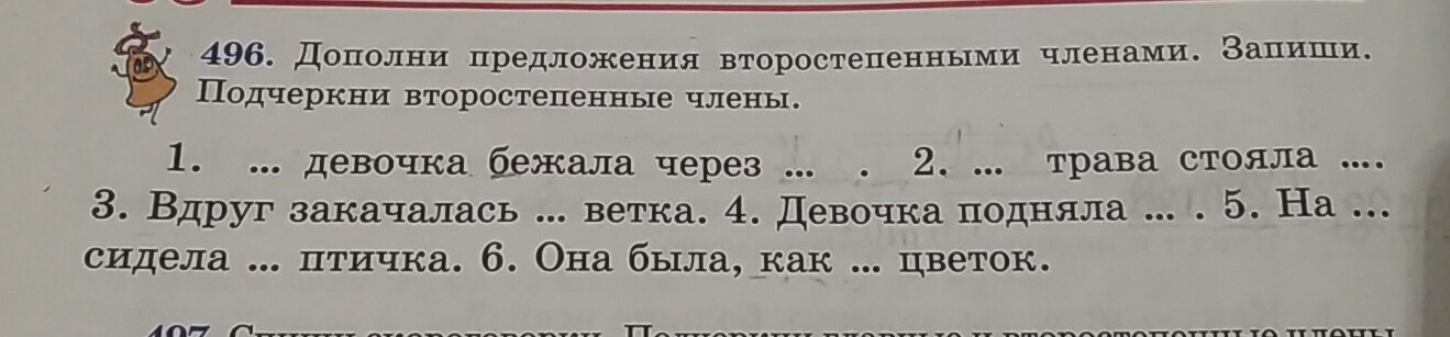 1. Маленькая(волнистая линия - определение) девочка бежала через лес(пунктир). 2. Лесная(волнистая) трава стояла по пояс (пунктир) 3. Вдруг закачалась соседняя(волнистая) ветка. 4. Девочка подняла глаза(пунктир). 5. На веточке сидела яркая(волнистая) птичка. 6. Она была, как пёстрый(волнистая) цветок.