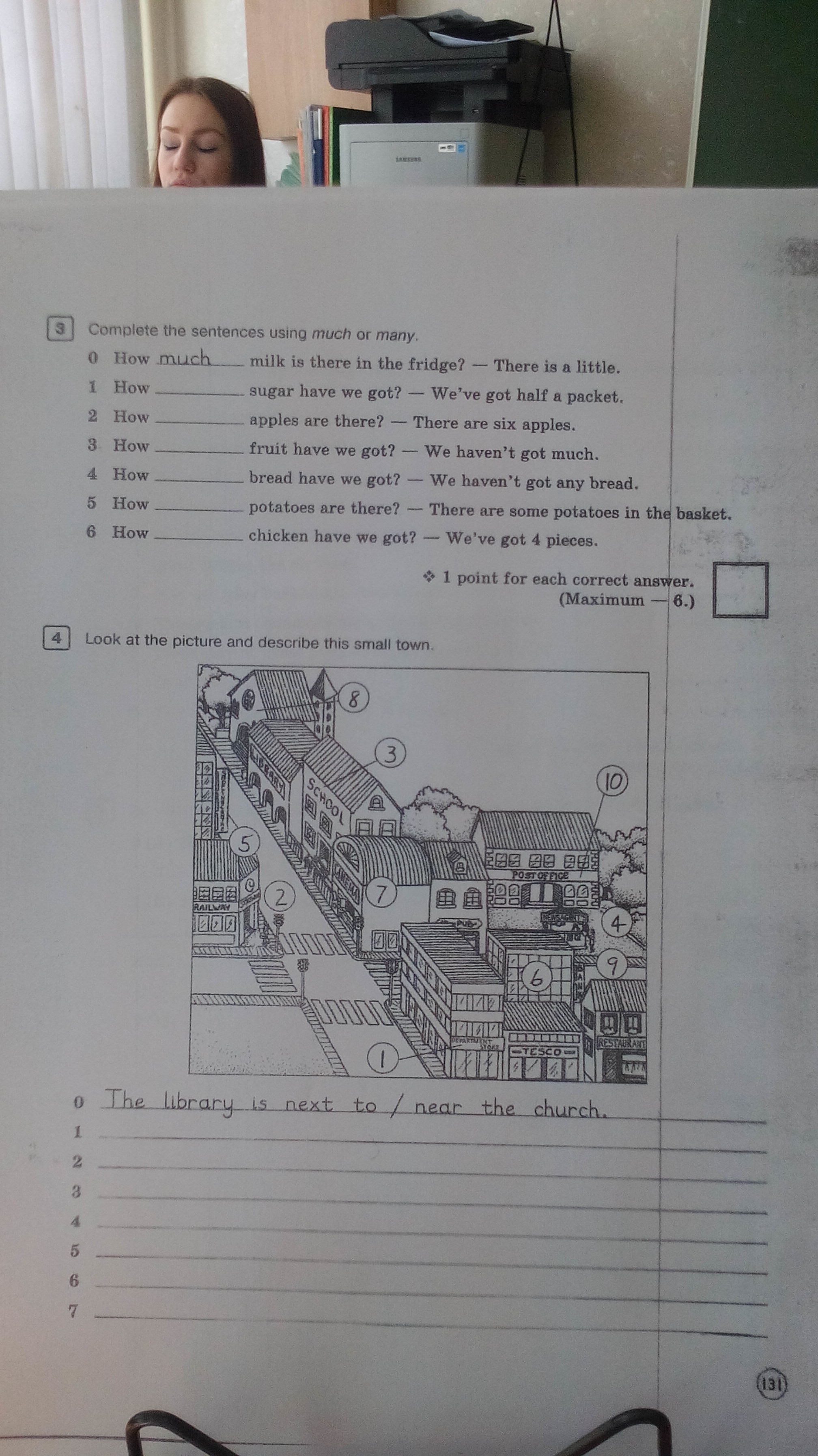 1 The department store is on the right of the Tesco. 2 The traffic light is in front of the railway station. 3 The School is between the library and the cinema. 4 The Newsagent is in front of the post office. 5 The Railway station is opposite the cinema. 6 The Tesco is between the department store and the restaurant. 7 Cinema is near the School. 8 The church is next to the library. 9 Restaurant is on the left of the Tesco. 10 Post office is behind the pub.