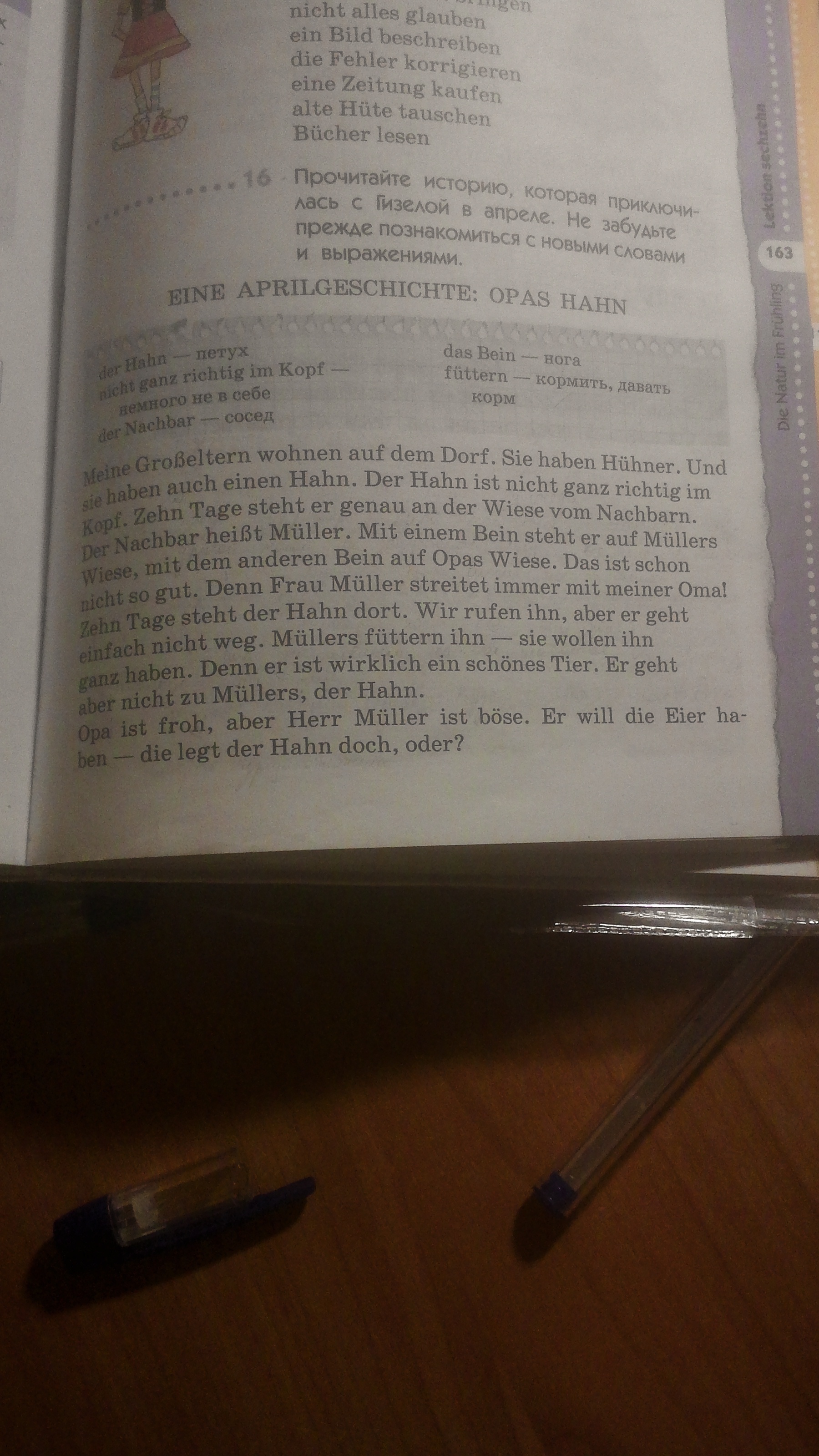 Мои бабушка с дедушкой живут в деревне. У них есть куры. И у них еще есть петух. У него не все в порядке с головой. Десять дней точно стоит он на лугу перед соседом. Соседа зовут Мюллер. Одной ногой стоит он на лугу Мюллера, а другой на бабушкином лугу. Это не очень-то хорошо. И потом, госпожа Мюллер всегда спорит с моей бабушкой! Десять дней стоит там петух. Мы звали его, но он не уходил прочь. Госпожа Мюллер кормит его - хочет заполучить его полностью. На самом деле он очень милое животное. Он-то, петух, не идет к Мюллерам.