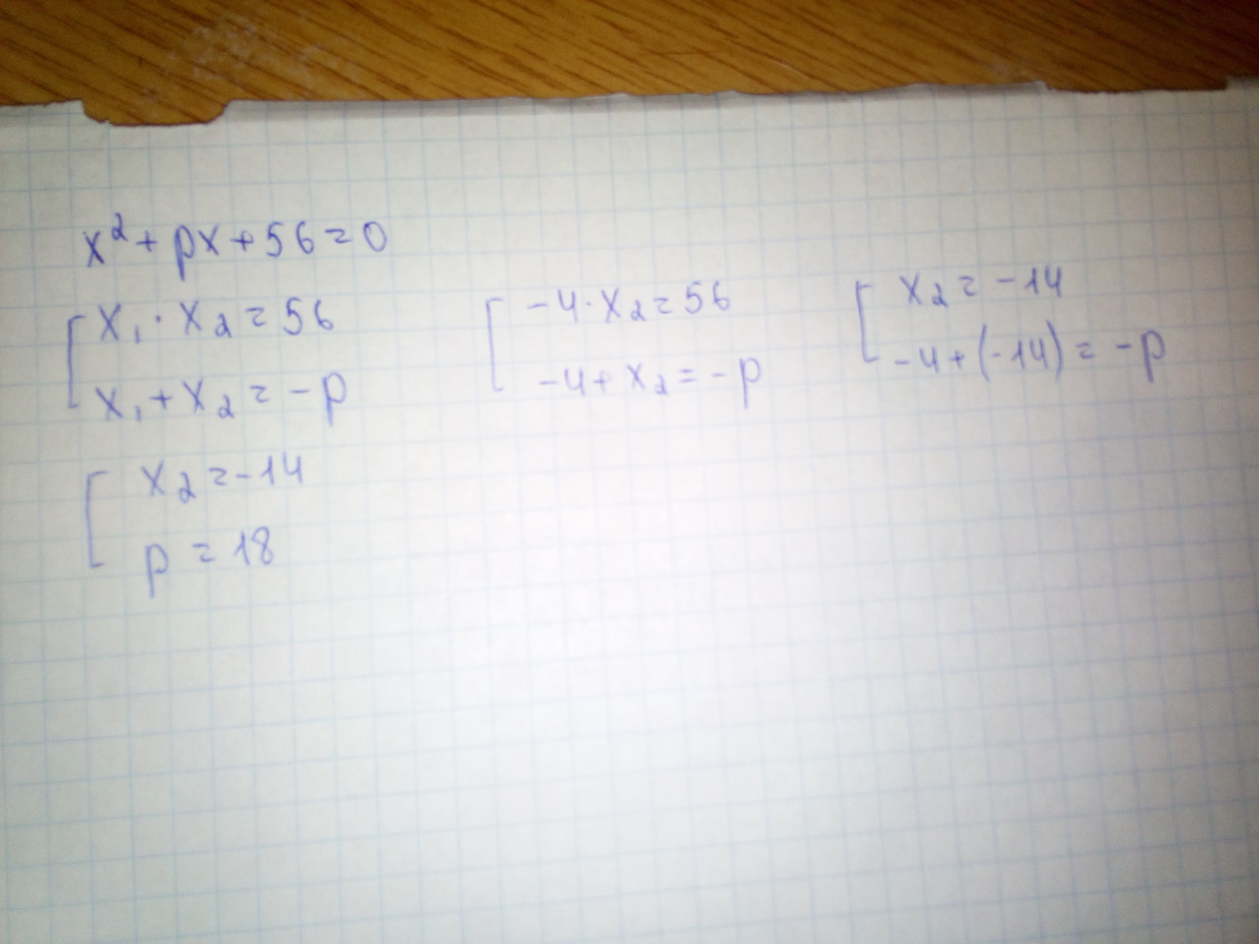 В уравнении х2 + рх + 56 = 0 один из его корней равен -4. Найдите другой корень и коэффициент р.