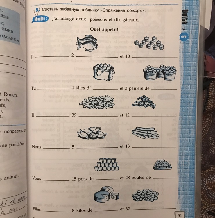 5)Vous avez mangé quinze pots de yaourt et vingt-huit boules de viande.(Вы съели пятнадцать горшочков йогурта и двадцать восемь мясных шариков.)