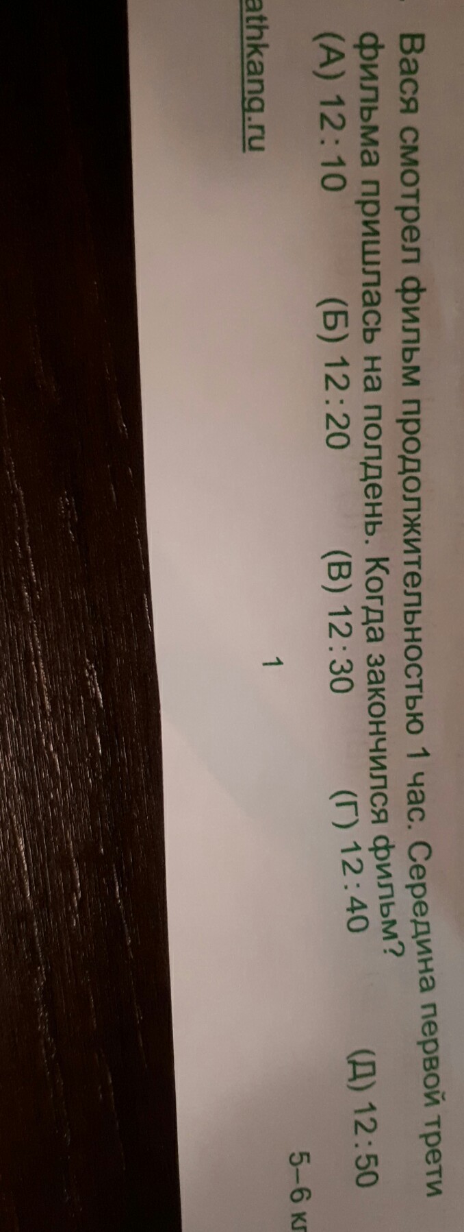 Фильм закончится в 12:50, т.к 1/3 от 60 минут=20 минут. По условию нам нужна середина 1/3, т.е половина 20 минут, что равняется 10 минутам. Т.е к 12 часам, Вася смотрел фильм всего 10 минут.
