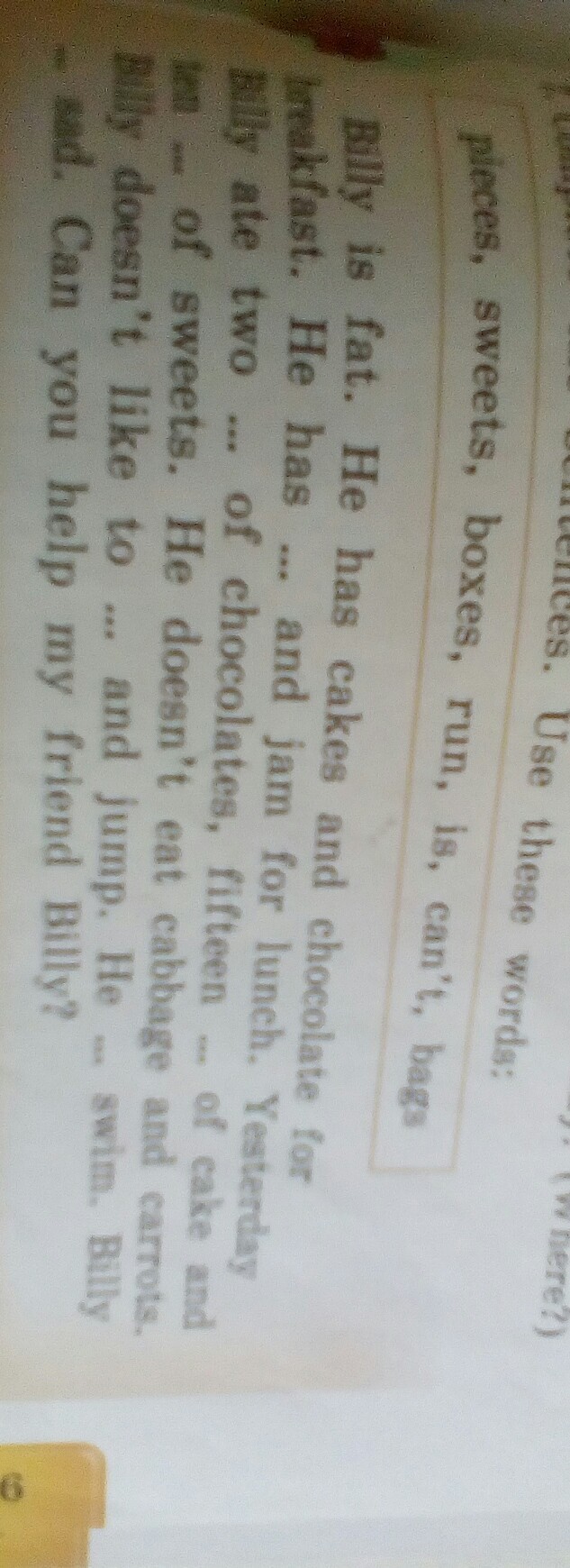 Billy is fat. He has cakes and chocolate for breakfast. He has sweets and jam for lunch. Yesterday Billy ate two boxes of chocolates, fifteen pieces of cake and ten bags of sweets. He doesn`t eat cabbage and carrots. Billy doesn`t like to run and jump. He can`t swim. Billy is sad. Can you help my friend Billy?