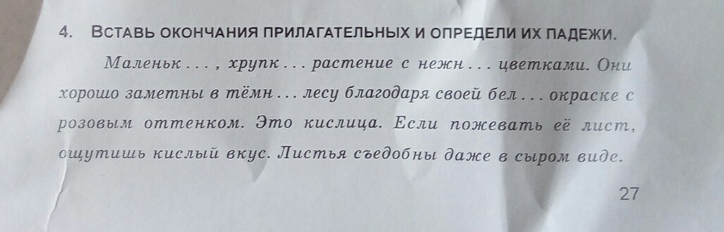 Маленькое (И. падеж), хрупкое (И. падеж) растение с нежными (Т. падеж) цветками. Они хорошо заметны в тёмном (П. падеж) лесу благодаря своей белой (Д. падеж) окраске с розовым оттенком. Это кислица. Если пожевать её лист, ощутишь кислый вкус. Листья съедобны даже в сыром виде.