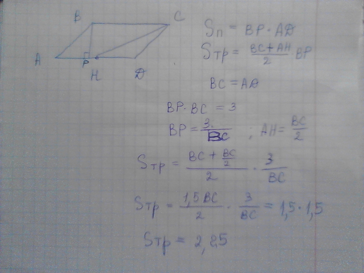 Площадь параллелограмма ABCD равна 3. Точка H - середина стороны AD. Найдите площадь трапеции AHCB