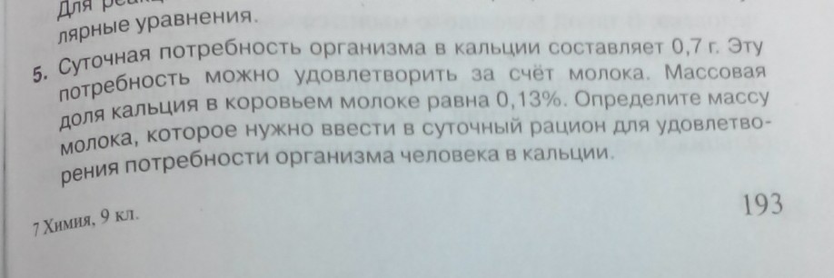 Суточная потребность организма в кальция составляет 0,7г. Эту потребность можно удовлетворить за счет молока. Массовая доля кальция в коробки молоке равна 0,13%. Определите массу молока, которое нужно ввести в суточный рацион для удовлетворения потребности организма человека в кальция.