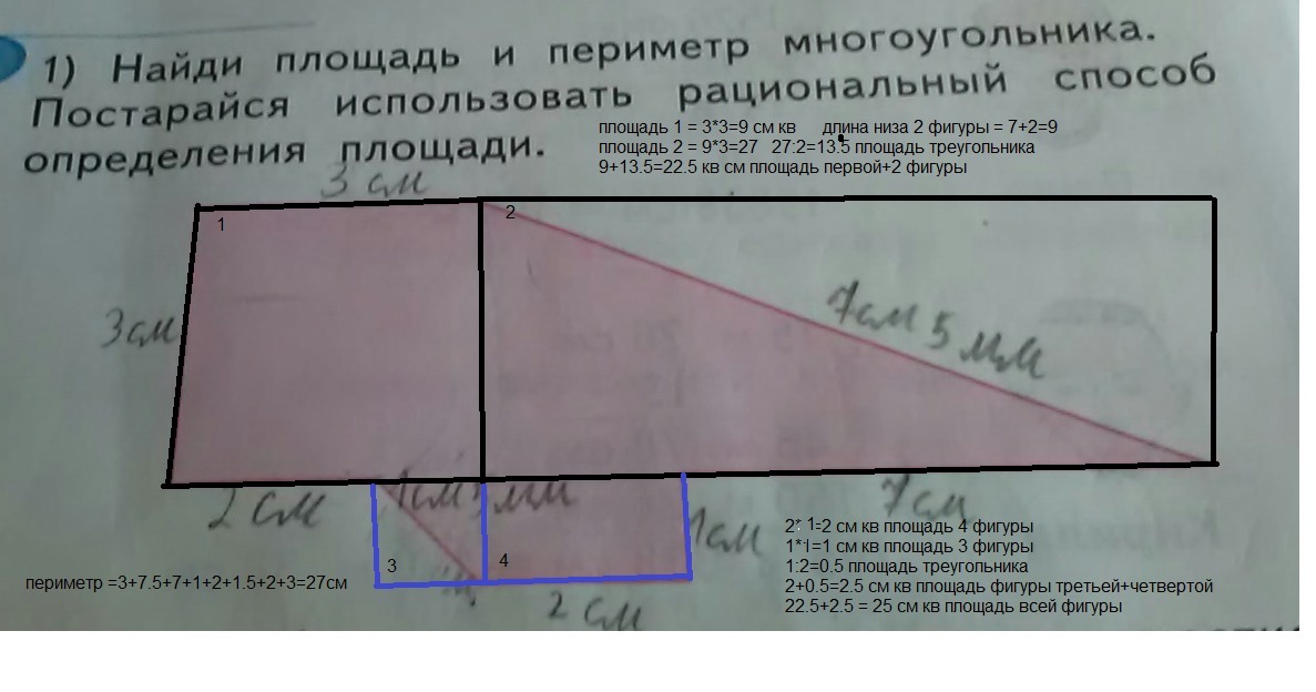 найди площадь и периметр многоугольника постарайся использовать рациональный способ определения площади