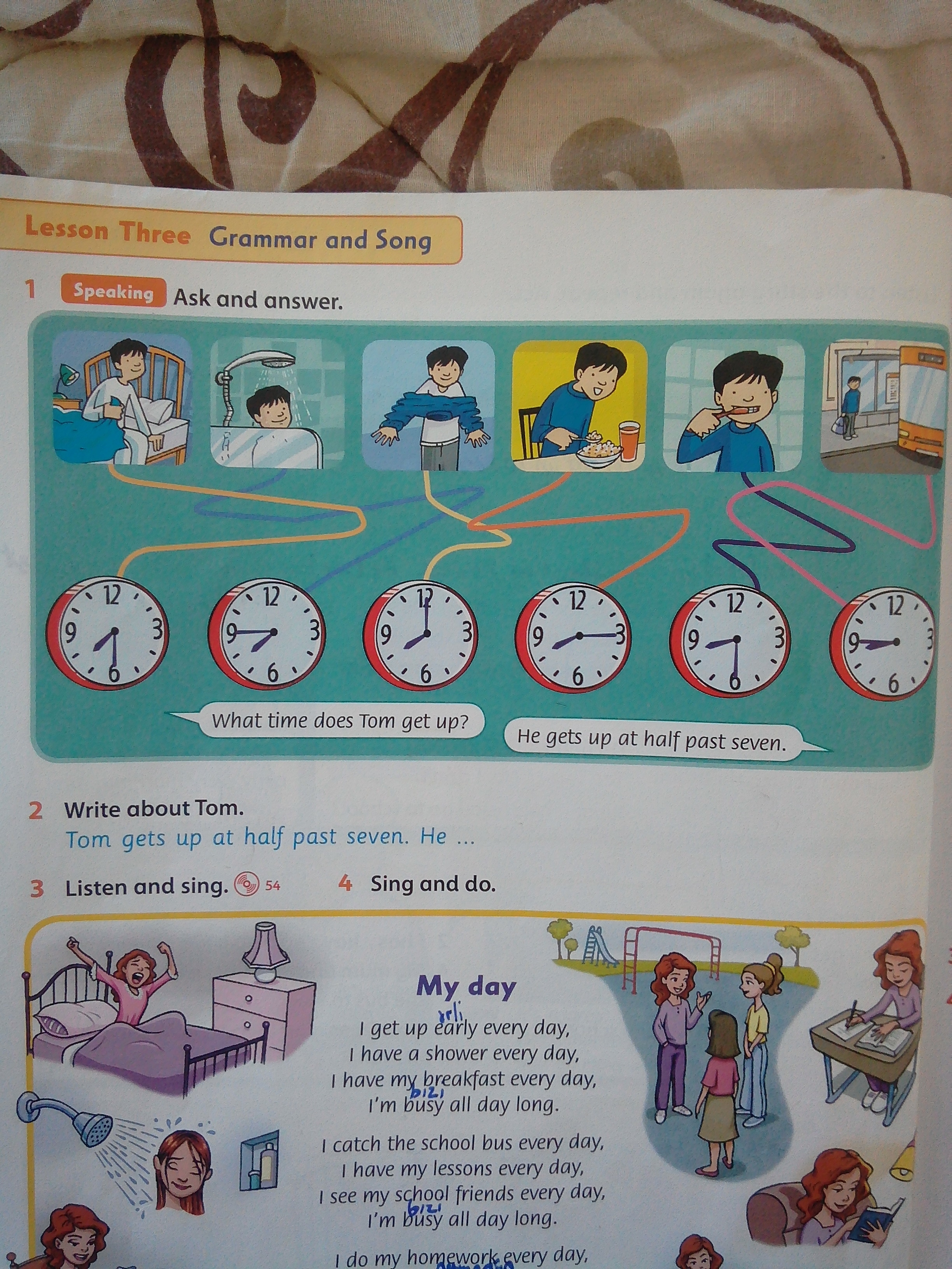 What time does Tom get up ? Относится этот вопрос к 1 картинке , Ответ по времини : It is six past eight