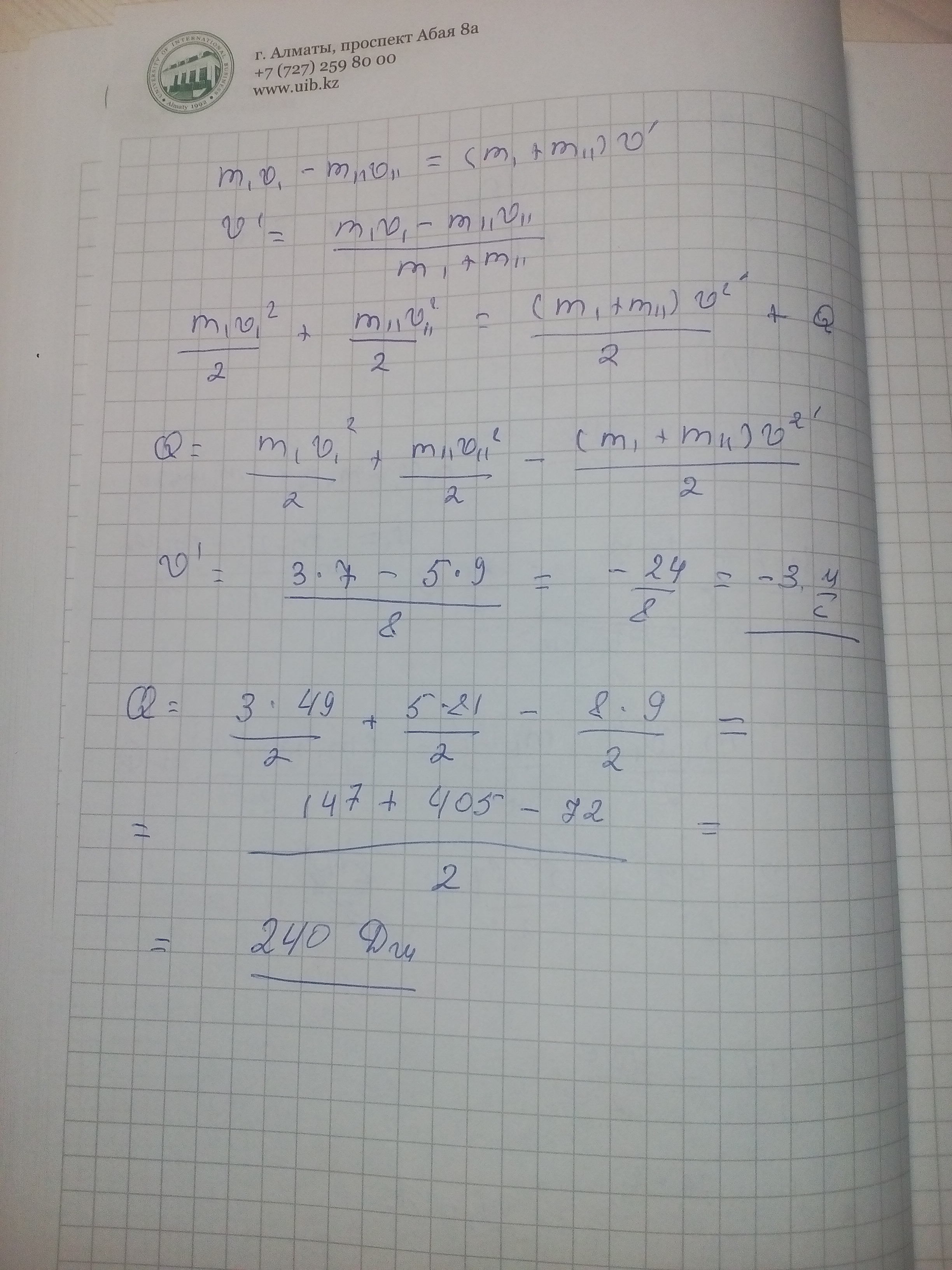 два тела массами 3 кг и 5 кг движутся навстречу друг другу со скоростями 7 м/с и 9 м/с. найти скорость движения тел после соударения и выделившуюся принеупругом ударе энергию.