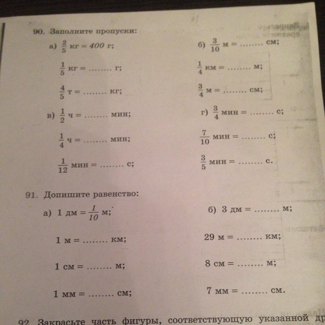 90 1/5кг=200г 4/5т=800кг 1/2ч=30мин 1/4ч=15мин 1/12мин=5с 1м=0,001км 1см=0,01м 1мм=0,1см