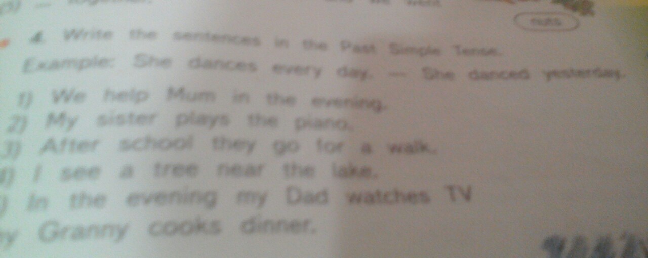 Мы помогаем маме вечером. Моя сестра играет на пианино. После школы они идут гулять. Я вижу дерево рядом с озером.Вечером мой отец смотрит телевизор.
