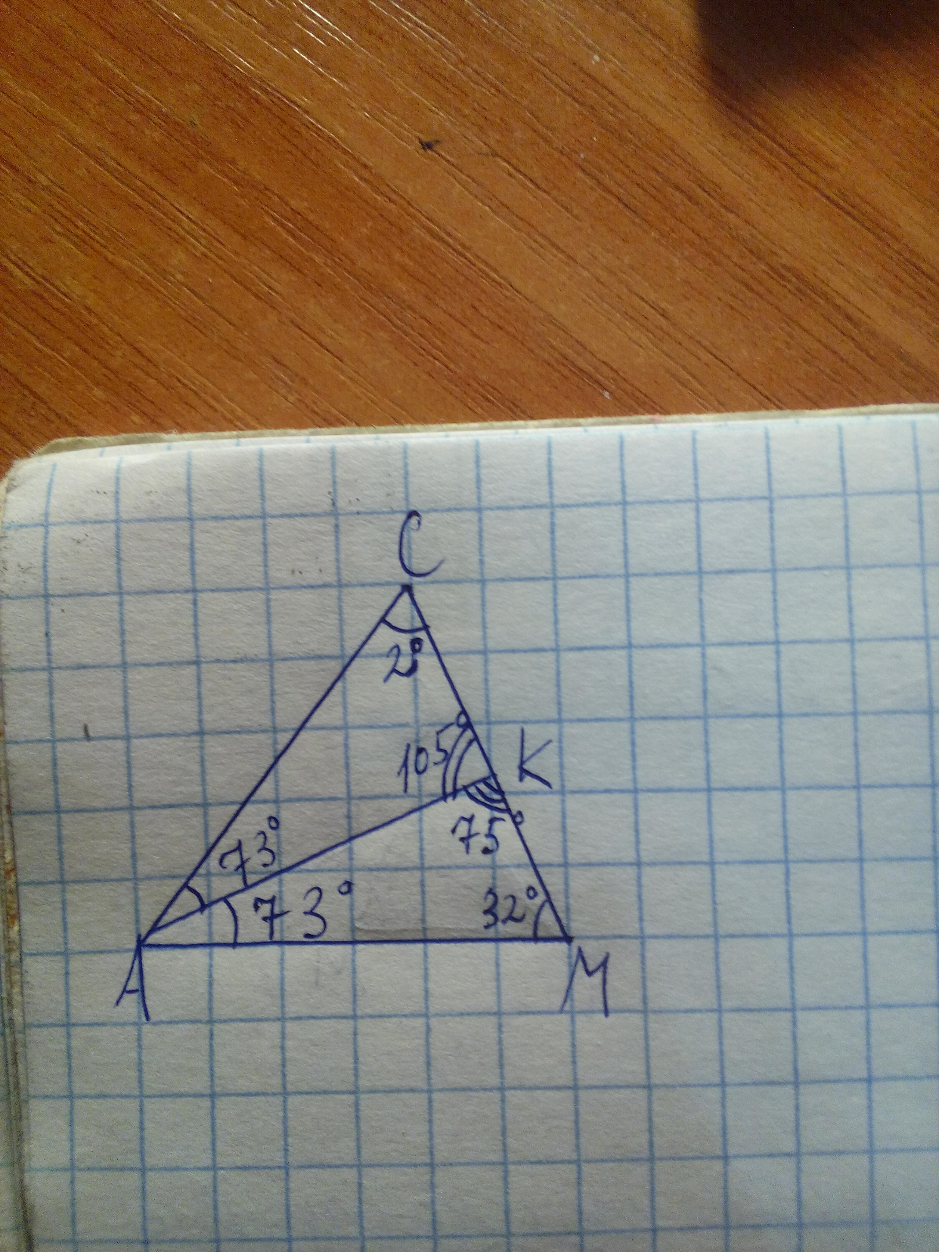 Помогите пожалуйста с геометрией.. В треугольнике АСМ проведена биссектриса АК.. Найдите угол С если угол М равен 32 градуса а угол АКС равен 105 градусов