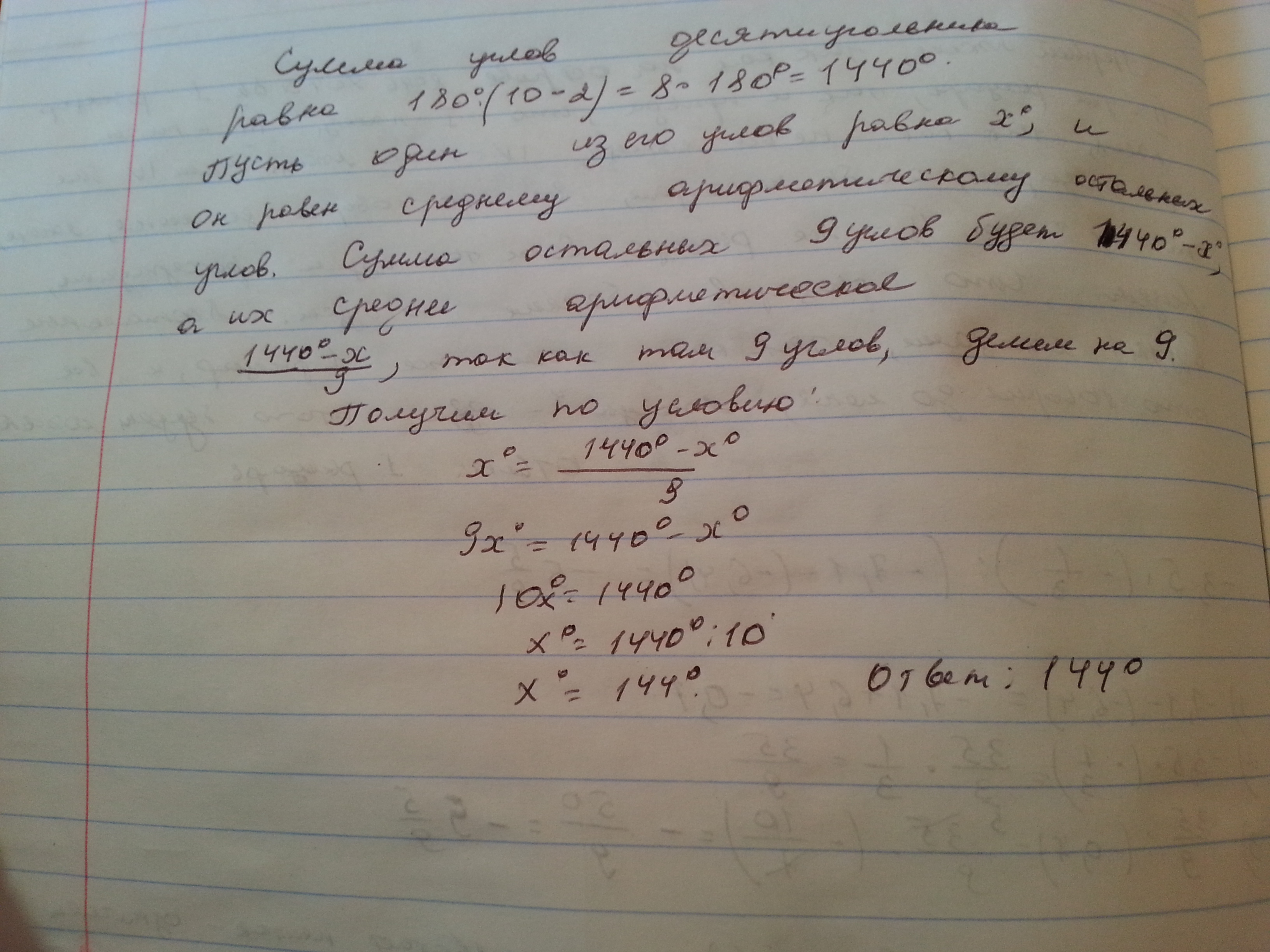 один из углов некоторого десятиугольника равен среднему арифметическому остальных углов Найдите этот угол