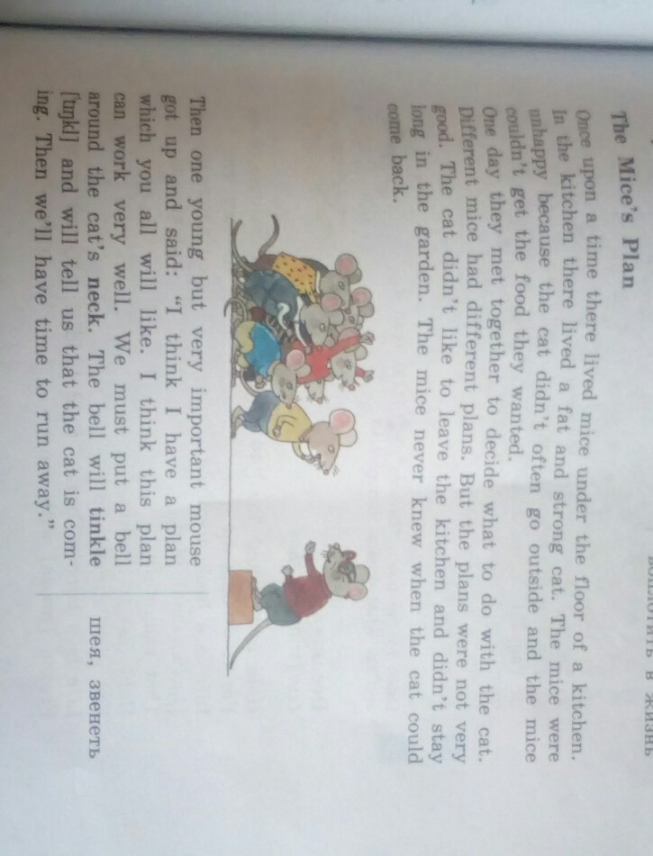 Тогда одна молодая, но очень важная мышь встала и сказала: "Я думаю, что у меня есть план, который вам всем понравится. Я думаю, что этот план может очень хорошо сработать. Мы должны привязать (наложить) колокольчик на шею кота. Это скажет нам, что кошка идёт, и тогда у нас будет время убежать."