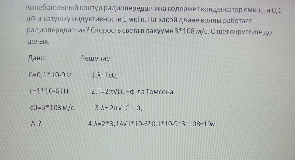 Колебательный контур радиопередатчика содержит конденсатор ёмкостью 0,1 нФ и катушку индуктивностью 1 мкГн. На какой длине волны работает радиопередатчик? Скорость распространения электромагнитных волн с = 3 · 108 м/с. Ответ округлите до целых.