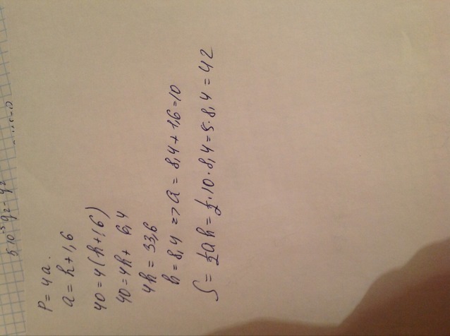 P= 4a. A= h+ 1,6 40= 4h + 6.4 4h=33.6 H= 8.4 a= 8.4 + 1,6= 10 S= 1/2 ah= 1/2* 10* 8.4=42