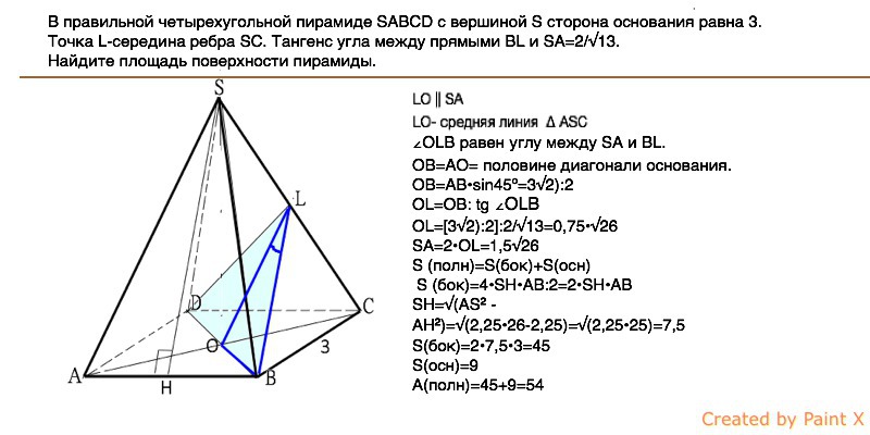 в правильной четырехугольной пирамиде sadcd с вершиной s сторона основания равна 3. Точка L-середина ребра sc. Тангенс угла между прямыми bL и sa=2/корень из 13. Найдите площадь поверхности пирамиды