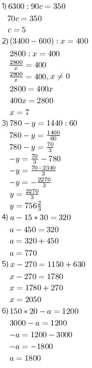 Реши уравнение. 6 300:90*c=350 [3 400-600]:x=400 780-y=1 440:60 a-15*30=320 x-270=1 150+630 150*20-a=1 200