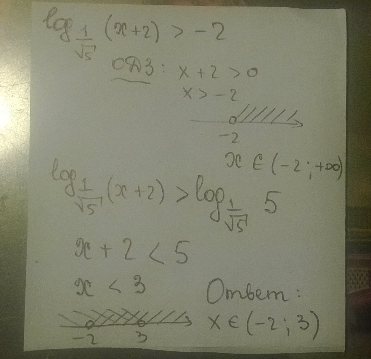 При каких значениях х выполняется неравенство log(1/√5) (X+2)>-2? (Тут первая скобка-это основание)