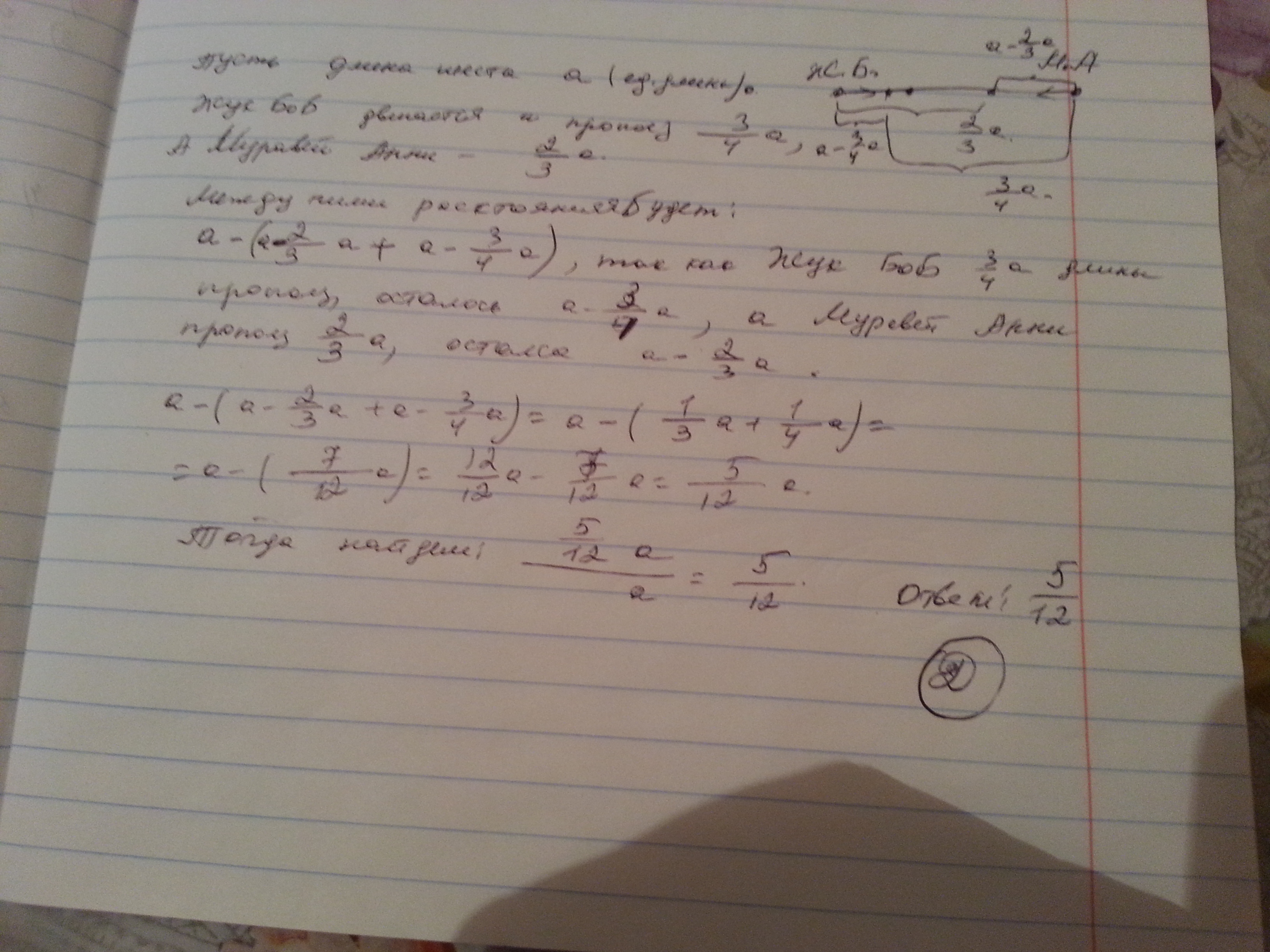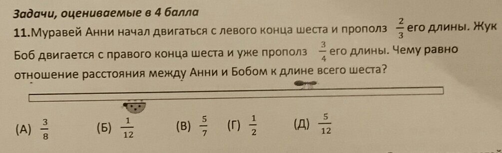 муравей Анни начал двигаться с левого конца шеста прополз 2/3 его длины. Жук Боб двигается с правого конца шеста и уже прополз 3/4 его длины. Чему равно отношение расстояния между Анни и Бобом к длине всего шеста?