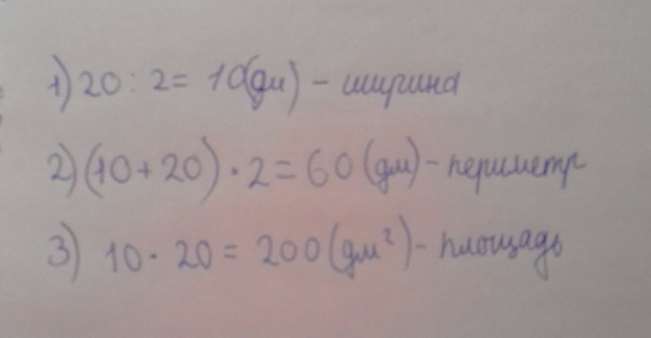 оконное стекло имеет длину 20дм, а ширина составляет половину длины. чему равна Площадь?Периметр?