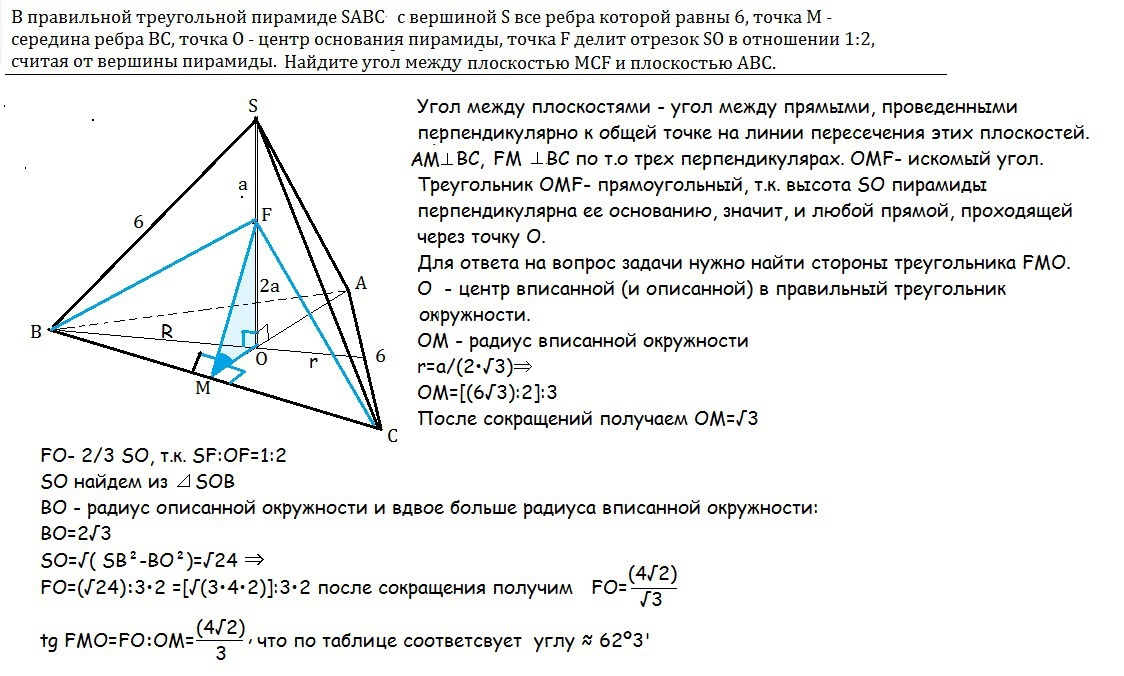 B правильной треугольной пирамиде SABC с вершиной S все ребра которой равны 6, точка М - середина ребра BC, точка О - центр основания пирамиды, точка F делит отрезок SO в отношении 1:2, считая от вершины пирамиды. Найдите угол между плоскостью MCF и плоскостью ABC.
