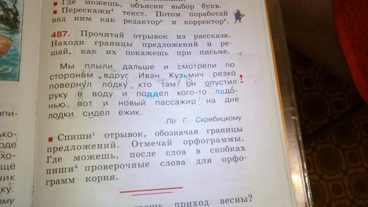 Мы плыли дальше и смотрели(смотр)по сторонам(стороны).Вдруг Иван Кузьмич резко повернул лодку.Кто там?Он опустил руку в воду и поддел кого-то ладонью.Вот и новый пассажир!На дне лодки(лодочка)сидел ёж.