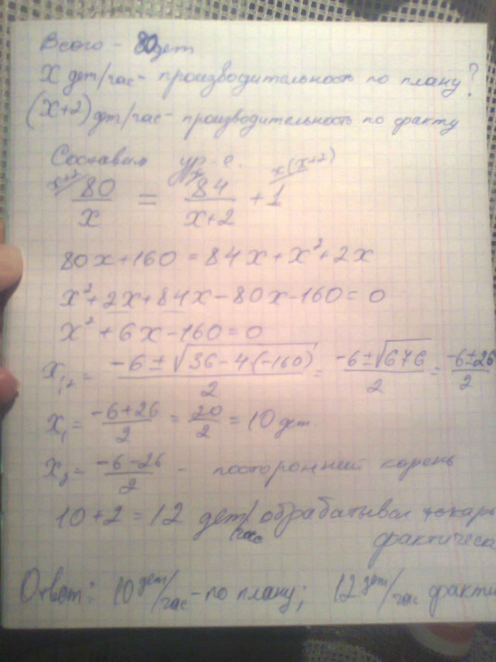 токарь должен был обработать 80 деталей к определенному сроку. он обработал в час на 2 детали больше, чем планировал, и уже за 1 час до срока обработал на 4 детали больше. сколько деталей в час обрабатывал токарь?