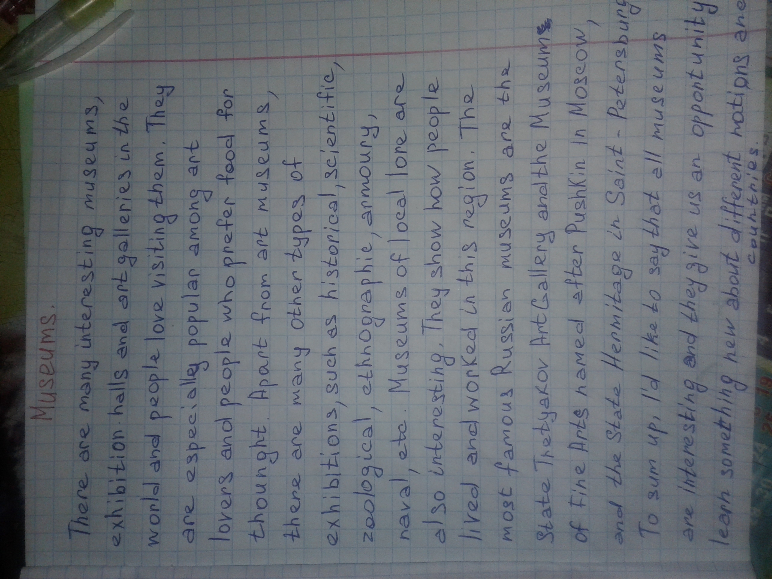 На английском языкеПеревод на русский языкMuseumsМузеиThere are many interesting museums, exhibition halls and art galleries in the world and people love visiting them. They are especially popular among art lovers and people who prefer food for thought. Apart from art museums, there are many other types of exhibitions, such as historical, scientific, zoological, ethnographic, armoury, naval, etc. Museums of local lore are also interesting. They show how people lived and worked in this region. The most famous Russian museums are the State Tretyakov Art Gallery and the Museum of Fine Arts named after Pushkin in Moscow, and the State Hermitage in Saint-Petersburg. The Hermitage houses more than 350 exhibition halls with a very rich collection of art works. The largest Museum of Great Britain is the British Museum, which is famous for its huge library. The most famous museum in France is the Louvre. I have once visited the Pushkin Museum of Fine Arts and it was an unforgettable experience. There I understood that art reflects life and appeals to our hearts and minds. This museum has one of the largest collections of the ancient, oriental and classical art in the world. Apart from paintings, I saw some outstanding sculptures there. The Pushkin Museum also holds one of the biggest collections of Ancient Egyptian Art. The Tretyakov Gallery is also huge and it contains mainly the works of famous Russian artists. One day isn’t enough to see all of its masterpieces. The museum has seven departments with portraits, seascapes, landscapes and other genres of painting. To sum up, I’d like to say that all museums are interesting and they give us an opportunity to learn something new about different nations and countries.В мире есть много интересных музеев, выставочных залов и картинных галерей, и люди любят посещать их. Они особенно популярны среди любителей искусства и людей, которые предпочитают пищу для размышлений. Помимо художественных музеев, есть много других видов выставок, таких как исторические, научные, зоологические, этнографические, оружейные, военно-морские и др. Не менее интересны краеведческие музеи. Они показывают, как люди жили и работали в данном регионе. Самые известные музеи России – это Государственная Третьяковская галерея и Музей изобразительных искусств имени Пушкина в Москве, а также Государственный Эрмитаж в Санкт-Петербурге. Эрмитаж умещает более 350 выставочных залов с очень богатой коллекцией произведений искусства. Крупнейшим музеем Великобритании является Британский музей, который славится своей огромной библиотекой. Самый известный музей во Франции – это Лувр. Я однажды посетил Музей изобразительных искусств им. Пушкина, и это был незабываемый опыт. Там я понял, что искусство отражает жизнь и отражается в наших сердцах и умах. Этот музей имеет одну из самых больших коллекций древнего, восточного и классического искусства в мире. Помимо картин, я увидел там некоторые выдающиеся скульптуры там. Пушкинский музей также имеет одну из самых больших коллекций древнеегипетского искусства. Третьяковская галерея также огромна, и в основном содержит произведения известных русских художников. Одного дня недостаточно, чтобы увидеть все её шедевры. В музее имеется семь отделов с портретами, морскими пейзажами, просто пейзажами и другими жанрами живописи. Подводя итог, я хотел бы сказать, что все музеи интересны, и они дают нам возможность узнать что-то новое о разных народностях и странах