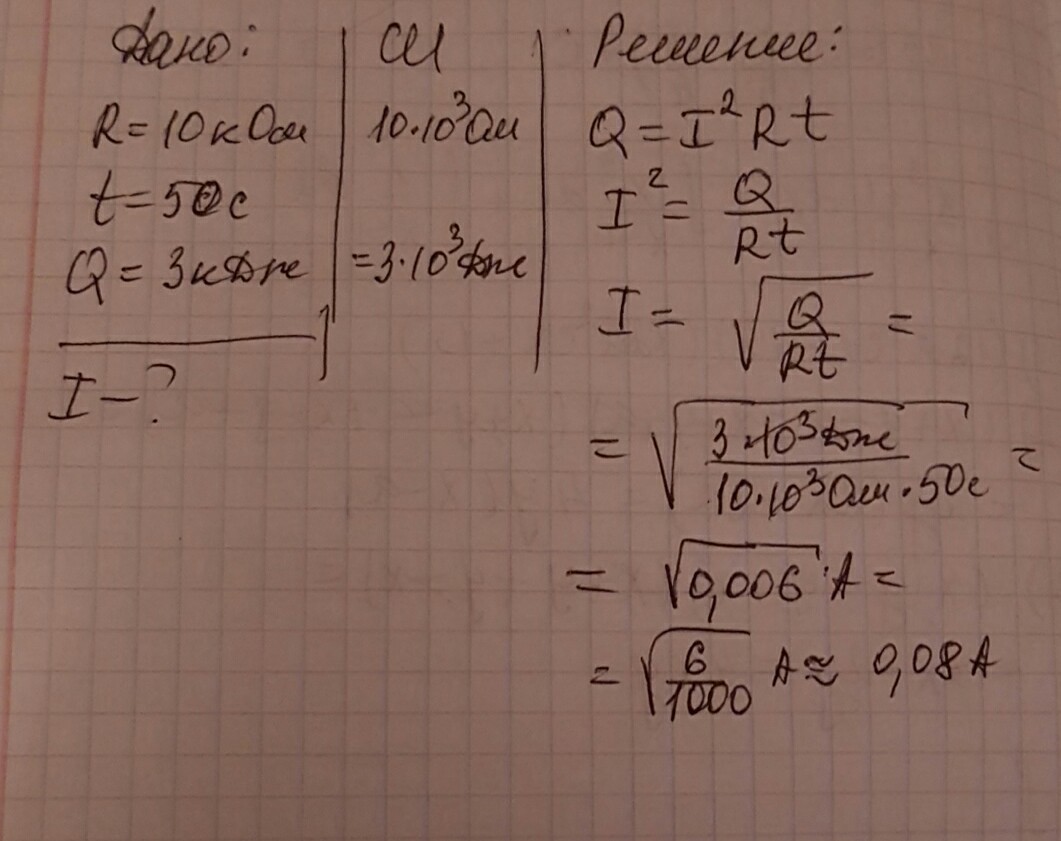 При какой сила тока в проводнике сопротивлением 10 кОм за 50 с выделится 3 кДж теплоты?