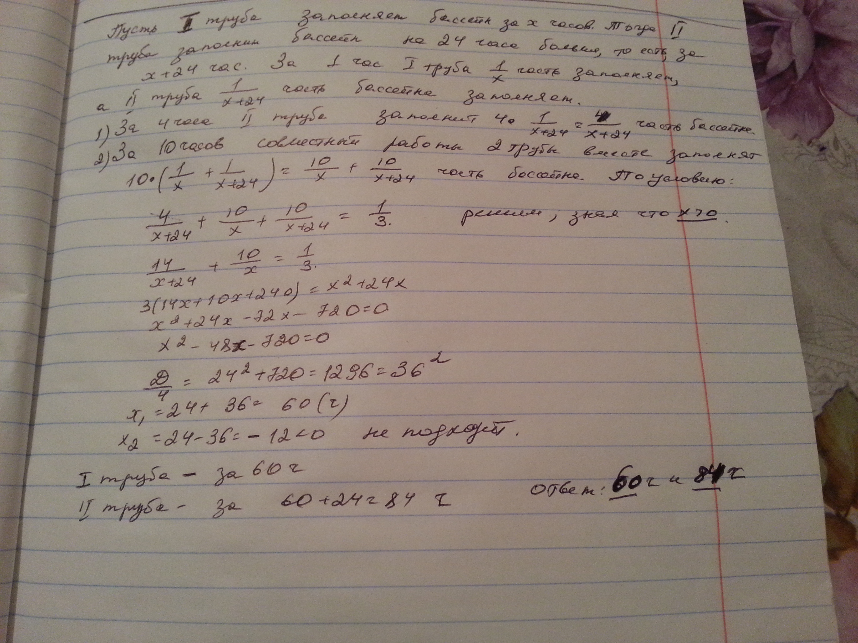 Пожалуйста Через первую трубу можно заполнить бассейн на 24 ч быстрее ,чем через вторую. Сначала открыли вторую трубу ,а через 4 часа -первую.Через 10 часов совместной работы двух труб водой было заполнено 1/3 часть бассейна. За сколько часов может наполнить бассейн каждая труба самостоятельно