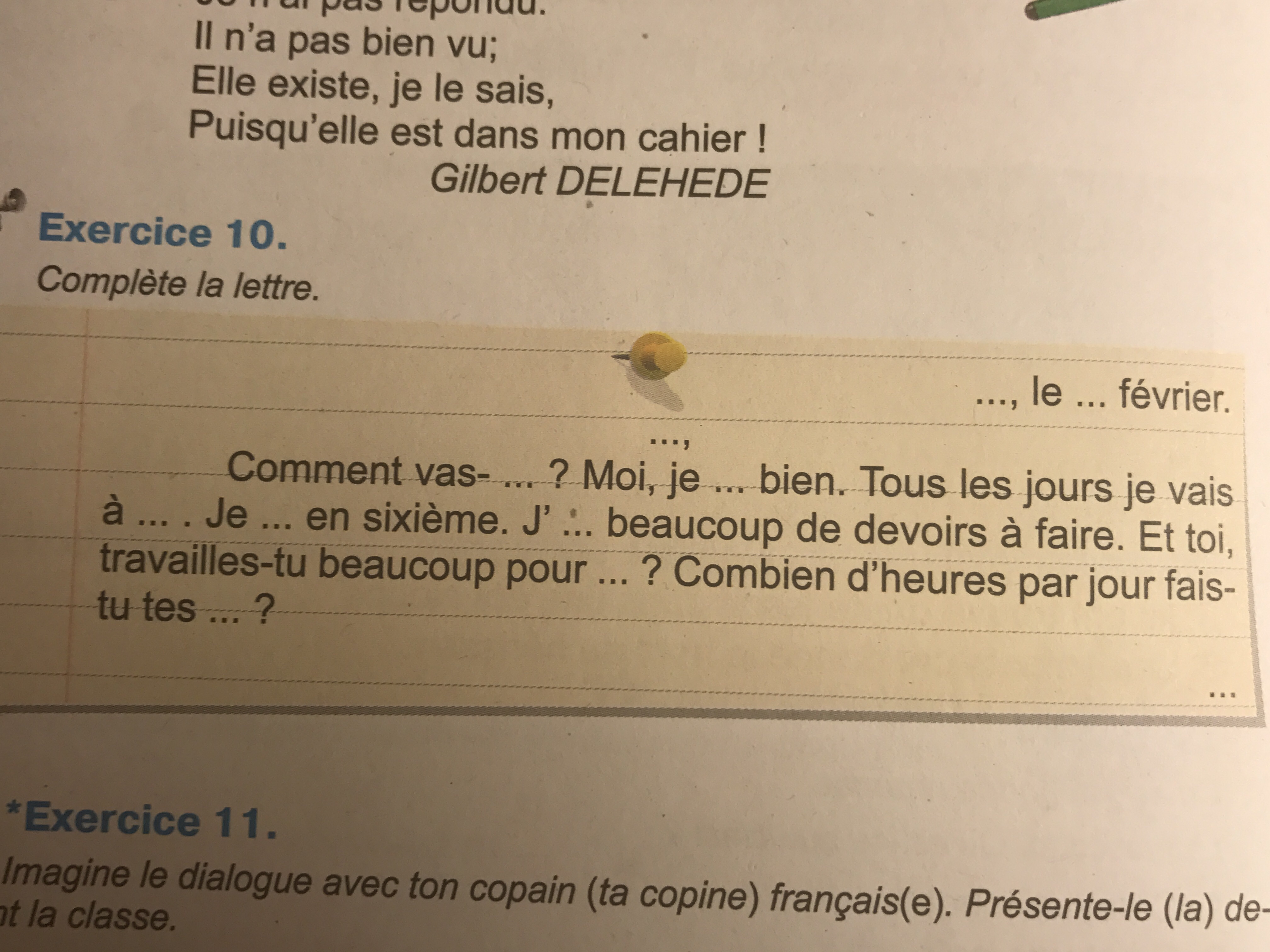 Comment vas- tu? Moi, je vais bien. Tous les jours je vais à l'école. Je suis en sixième. J'ai beaucoup de devoirs à faire. Et toi, travailles-tu beaucoup pour l'école? Combien d'heures par jour fais-tu tes devoirs?