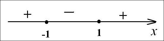 Рассмотрим функцию у = (х - 1)(х + 1) и найдем интервалы, на которых данная функция принимает значения у ≤ 0. Решим неравенство методом интервалов.