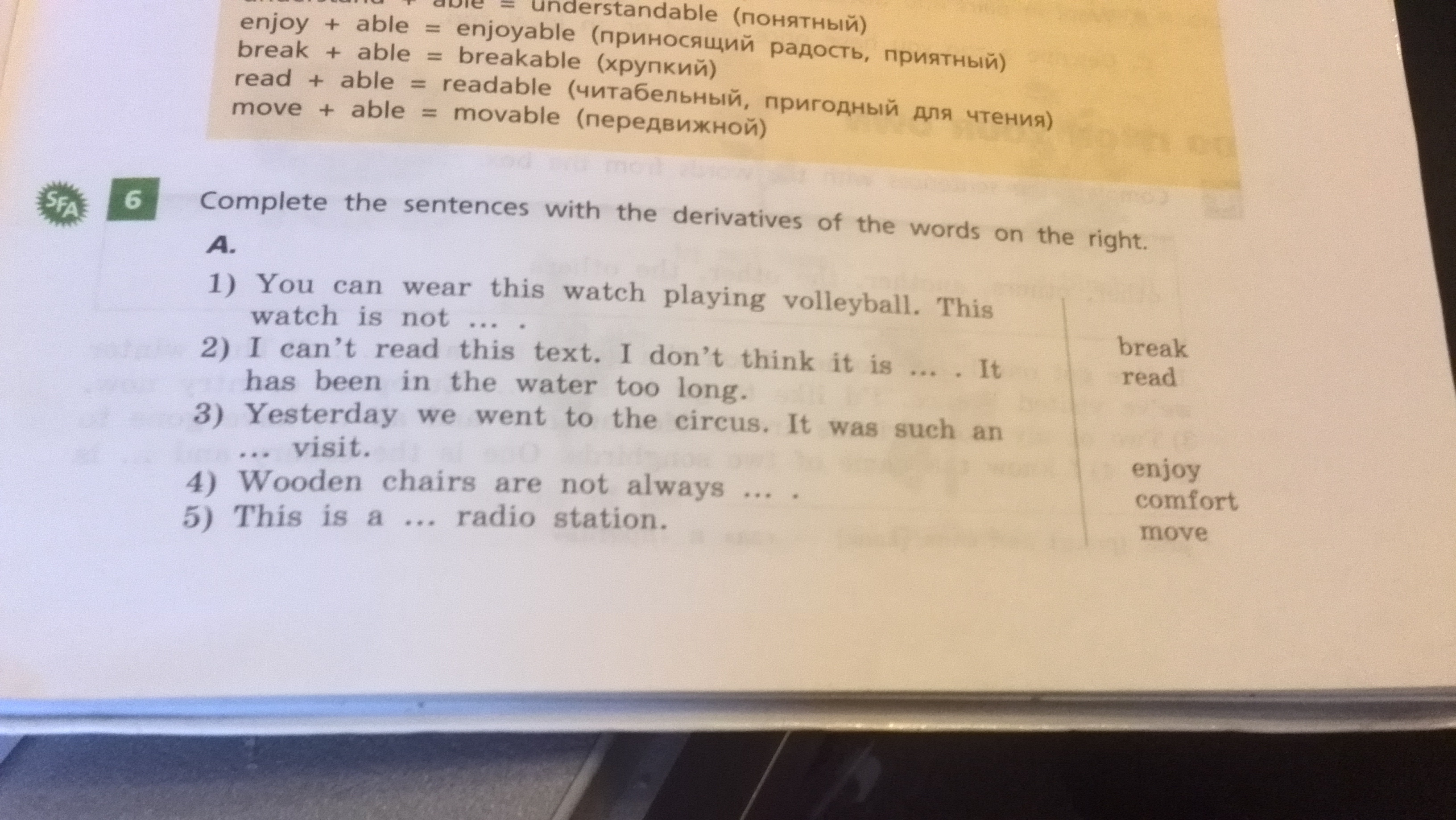 1 breakable 2 readable 3 enjoyable 4 comfortable 5 movable