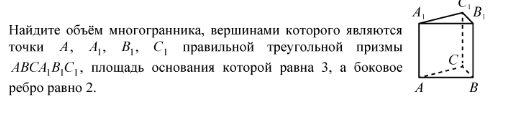 Найдите объем многогранника, вершинами которого являются точки правильной треугольной призмы АВСА1В1С1, площадь основания которой равна 3, а боковое ребро равно 2.
