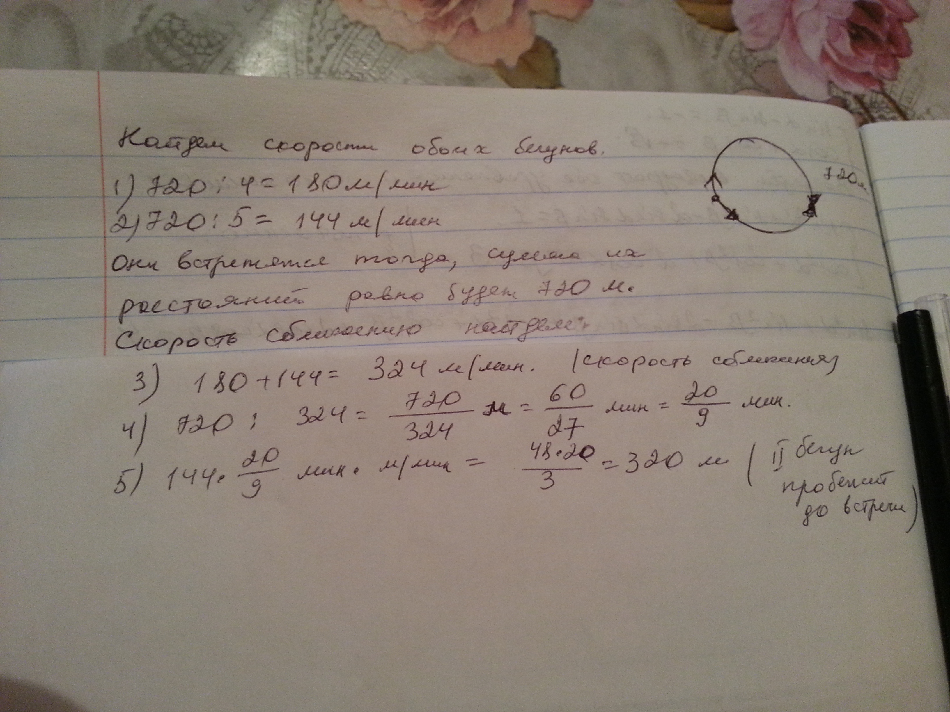 два бегуна тренируются на круговой дорожке длиной 720 метров ; первый ее пробегает за 4 минуты , а второй- за 5 . Они стартовали из одной точки в противоположных направлениях . Сколько метров пробежит до точки первой встречи второй бегун .