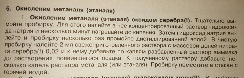 После помещения пробирки в горячую воду на стенках пробирки появляется металлический налёт( плёнка серебра). Реакция серебряного зеркала.НС(Н)=О+[Ag(NH3)2]OH ⇒ НСООН+Ag+2NH3+H2O